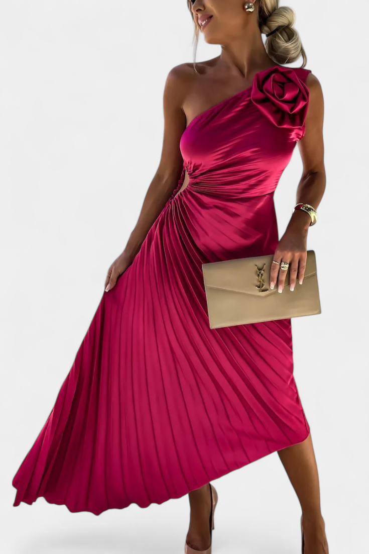 Elegancia contemporánea con un giro artístico. El vestido Leire redefine el estilo de cóctel con su silueta asimétrica de una sola manga y un delicado aplique floral en el hombro. La falda plisada fluye con movimiento refinado, creando una presencia cautivadora perfecta para celebraciones especiales.